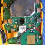 compartimento de pilas. Se trata de dos láminas metálicas dobladas que hacen contacto con dos “pads” en el circuito impreso. Debido al traqueteo propio de viajar en el manillar de una bici, estas láminas rozan continuamente los pads en el circuito impreso creando un rayajo que elimina parte del material conductor. Cuando las láminas se vuelven a mover o se produce cualquier cambio físico (temperatura) o químico (humedad) en el ambiente existen muchas probabilidades de que el contacto eléctrico entre lámina y pad desaparezca durante unos microsegundos, suficientes para hacer que se apague la unidad.