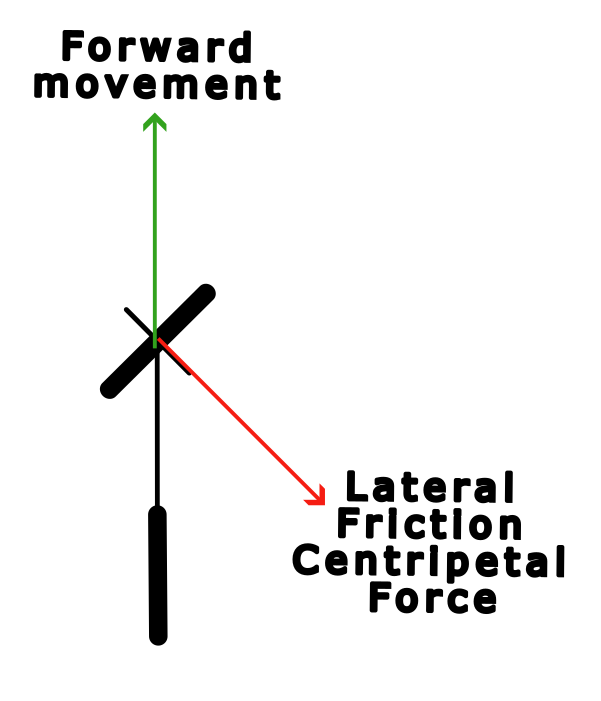 Good old Isaac Newton taught us with his first law of motion that a moving vehicle tends to keep its momentum if no forces act upon it. When a bicycle enters a turn, the nature of movement will make it go on a straight line, unless we turn the handlebars (forget about leaning for now; let’s keep it simple). Turning the wheel makes static friction enter the scene in the form of a centripetal force that opposes that straight line movement, so the bike changes direction towards the tangent of a turning circle, and keeps turning until we set the bars straight again.