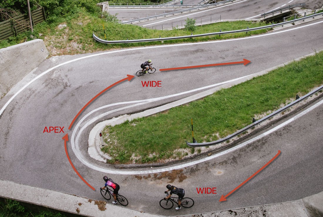 Well, as long as you are free to adjust your position on the road before the turn, you can actually alter the curve radius. We call the racing line the ideal path a cyclist takes through a corner to maintain speed and control. The racing line can vary based on the shape and characteristics of the turn, but it almost always involves opening wide at the entry point, getting as close as possible to the apex, and opening again at the exit point. The result of this maneuver is actually widening the turn radius by creating a broader circle that is tangent to the original curve at the apex point. Bigger radius equals more speed. Even if you don’t know exactly where the apex is because the curve is new to you, you’ll have an approximate idea where it lays when you’ve been cycling -or racing any vehicle- for a number of years.