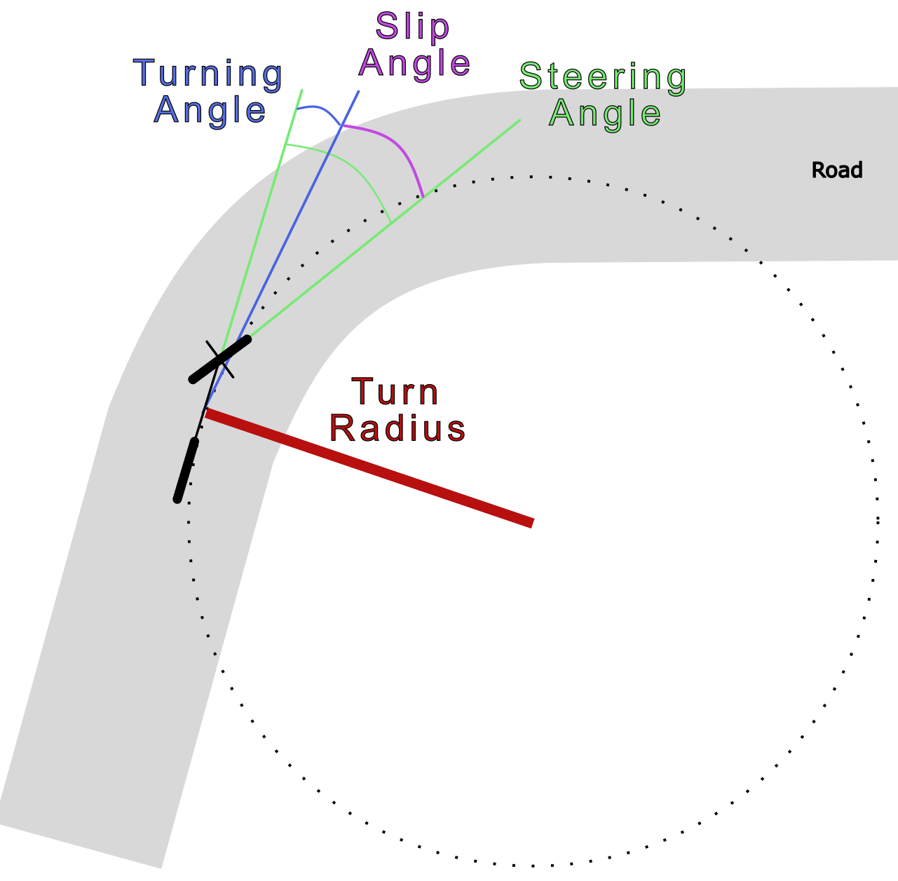 When we tilt the handlebars, we change the front wheel alignment at an angle deviating from the straight path. The steering angle creates a turning angle that lets us know what the radius of the turn will be. The turning angle is not equal to the steering angle because turning wheels have a ‘slip angle’, but we’ll consider them the same (they are very close at low speeds), again, to simplify.